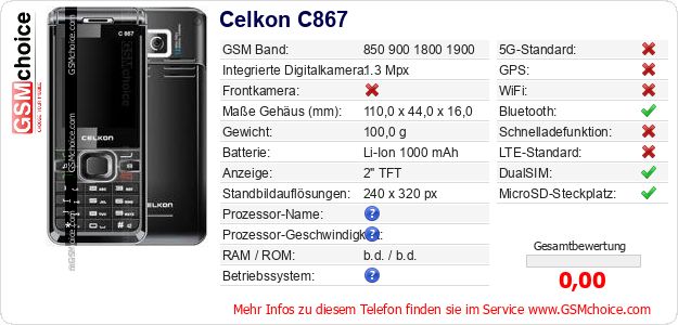 Hast du eigene Webseite? Willst du die Informationen über Standarddaten des Handys Celkon C867 irgendwo veröffentlichen? Das ist sehr einfach. Du kannst das Bild herunterladen oder kopieren und auf der Webseite folgenden Code hinzufügen:Das Einfügen von diesem Code verursacht das Anzeigen von dem folgenden Bild: