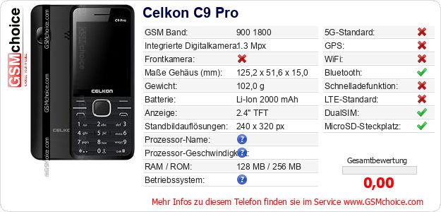 Hast du eigene Webseite? Willst du die Informationen über Standarddaten des Handys Celkon C9 Pro irgendwo veröffentlichen? Das ist sehr einfach. Du kannst das Bild herunterladen oder kopieren und auf der Webseite folgenden Code hinzufügen:Das Einfügen von diesem Code verursacht das Anzeigen von dem folgenden Bild: