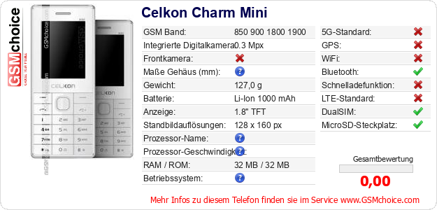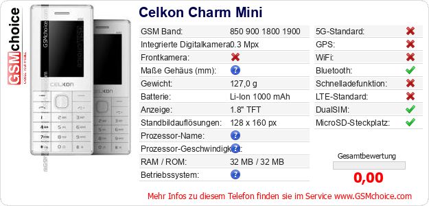 Hast du eigene Webseite? Willst du die Informationen über Standarddaten des Handys Celkon Charm Mini irgendwo veröffentlichen? Das ist sehr einfach. Du kannst das Bild herunterladen oder kopieren und auf der Webseite folgenden Code hinzufügen:Das Einfügen von diesem Code verursacht das Anzeigen von dem folgenden Bild: