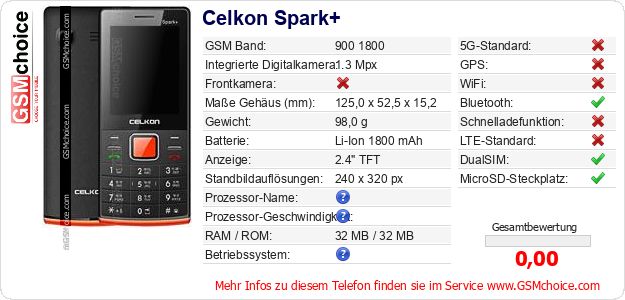 Hast du eigene Webseite? Willst du die Informationen über Standarddaten des Handys Celkon Spark+ irgendwo veröffentlichen? Das ist sehr einfach. Du kannst das Bild herunterladen oder kopieren und auf der Webseite folgenden Code hinzufügen:Das Einfügen von diesem Code verursacht das Anzeigen von dem folgenden Bild: