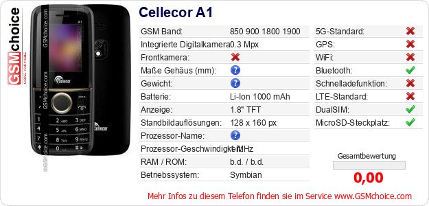 Hast du eigene Webseite? Willst du die Informationen über Standarddaten des Handys Cellecor A1 irgendwo veröffentlichen? Das ist sehr einfach. Du kannst das Bild herunterladen oder kopieren und auf der Webseite folgenden Code hinzufügen:Das Einfügen von diesem Code verursacht das Anzeigen von dem folgenden Bild: