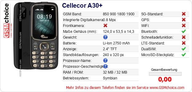Hast du eigene Webseite? Willst du die Informationen über Standarddaten des Handys Cellecor A30+ irgendwo veröffentlichen? Das ist sehr einfach. Du kannst das Bild herunterladen oder kopieren und auf der Webseite folgenden Code hinzufügen:Das Einfügen von diesem Code verursacht das Anzeigen von dem folgenden Bild: