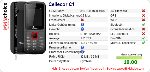 Hast du eigene Webseite? Willst du die Informationen über Standarddaten des Handys Cellecor C1 irgendwo veröffentlichen? Das ist sehr einfach. Du kannst das Bild herunterladen oder kopieren und auf der Webseite folgenden Code hinzufügen:Das Einfügen von diesem Code verursacht das Anzeigen von dem folgenden Bild:
