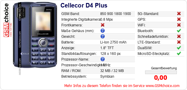 Hast du eigene Webseite? Willst du die Informationen über Standarddaten des Handys Cellecor D4 Plus irgendwo veröffentlichen? Das ist sehr einfach. Du kannst das Bild herunterladen oder kopieren und auf der Webseite folgenden Code hinzufügen:Das Einfügen von diesem Code verursacht das Anzeigen von dem folgenden Bild: