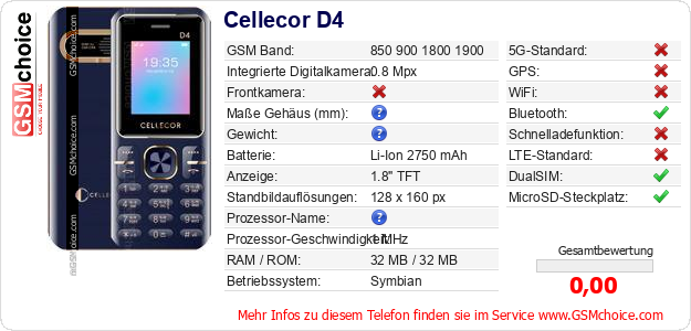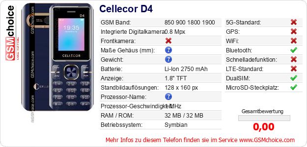 Hast du eigene Webseite? Willst du die Informationen über Standarddaten des Handys Cellecor D4 irgendwo veröffentlichen? Das ist sehr einfach. Du kannst das Bild herunterladen oder kopieren und auf der Webseite folgenden Code hinzufügen:Das Einfügen von diesem Code verursacht das Anzeigen von dem folgenden Bild: