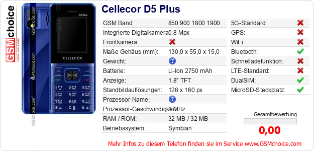 Hast du eigene Webseite? Willst du die Informationen über Standarddaten des Handys Cellecor D5 Plus irgendwo veröffentlichen? Das ist sehr einfach. Du kannst das Bild herunterladen oder kopieren und auf der Webseite folgenden Code hinzufügen:Das Einfügen von diesem Code verursacht das Anzeigen von dem folgenden Bild:
