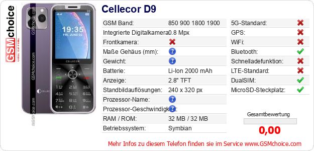 Hast du eigene Webseite? Willst du die Informationen über Standarddaten des Handys Cellecor D9 irgendwo veröffentlichen? Das ist sehr einfach. Du kannst das Bild herunterladen oder kopieren und auf der Webseite folgenden Code hinzufügen:Das Einfügen von diesem Code verursacht das Anzeigen von dem folgenden Bild: