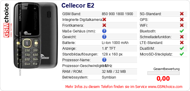 Hast du eigene Webseite? Willst du die Informationen über Standarddaten des Handys Cellecor E2 irgendwo veröffentlichen? Das ist sehr einfach. Du kannst das Bild herunterladen oder kopieren und auf der Webseite folgenden Code hinzufügen:Das Einfügen von diesem Code verursacht das Anzeigen von dem folgenden Bild: