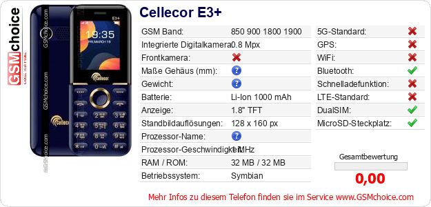 Hast du eigene Webseite? Willst du die Informationen über Standarddaten des Handys Cellecor E3+ irgendwo veröffentlichen? Das ist sehr einfach. Du kannst das Bild herunterladen oder kopieren und auf der Webseite folgenden Code hinzufügen:Das Einfügen von diesem Code verursacht das Anzeigen von dem folgenden Bild: