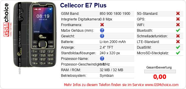 Hast du eigene Webseite? Willst du die Informationen über Standarddaten des Handys Cellecor E7 Plus irgendwo veröffentlichen? Das ist sehr einfach. Du kannst das Bild herunterladen oder kopieren und auf der Webseite folgenden Code hinzufügen:Das Einfügen von diesem Code verursacht das Anzeigen von dem folgenden Bild: