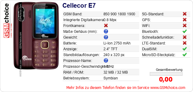 Hast du eigene Webseite? Willst du die Informationen über Standarddaten des Handys Cellecor E7 irgendwo veröffentlichen? Das ist sehr einfach. Du kannst das Bild herunterladen oder kopieren und auf der Webseite folgenden Code hinzufügen:Das Einfügen von diesem Code verursacht das Anzeigen von dem folgenden Bild: