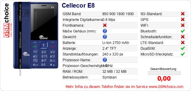 Hast du eigene Webseite? Willst du die Informationen über Standarddaten des Handys Cellecor E8 irgendwo veröffentlichen? Das ist sehr einfach. Du kannst das Bild herunterladen oder kopieren und auf der Webseite folgenden Code hinzufügen:Das Einfügen von diesem Code verursacht das Anzeigen von dem folgenden Bild: