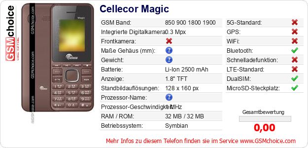 Hast du eigene Webseite? Willst du die Informationen über Standarddaten des Handys Cellecor Magic irgendwo veröffentlichen? Das ist sehr einfach. Du kannst das Bild herunterladen oder kopieren und auf der Webseite folgenden Code hinzufügen:Das Einfügen von diesem Code verursacht das Anzeigen von dem folgenden Bild: