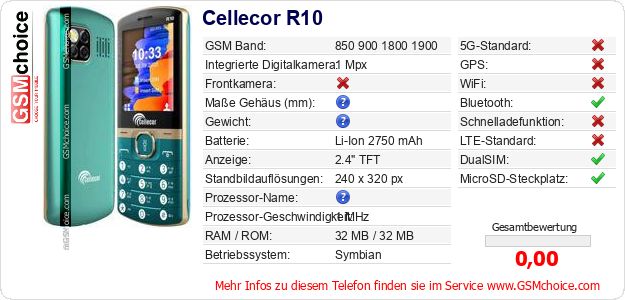 Hast du eigene Webseite? Willst du die Informationen über Standarddaten des Handys Cellecor R10 irgendwo veröffentlichen? Das ist sehr einfach. Du kannst das Bild herunterladen oder kopieren und auf der Webseite folgenden Code hinzufügen:Das Einfügen von diesem Code verursacht das Anzeigen von dem folgenden Bild: