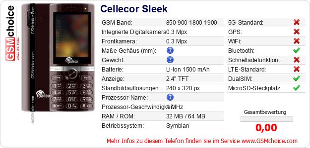 Hast du eigene Webseite? Willst du die Informationen über Standarddaten des Handys Cellecor Sleek irgendwo veröffentlichen? Das ist sehr einfach. Du kannst das Bild herunterladen oder kopieren und auf der Webseite folgenden Code hinzufügen:Das Einfügen von diesem Code verursacht das Anzeigen von dem folgenden Bild: