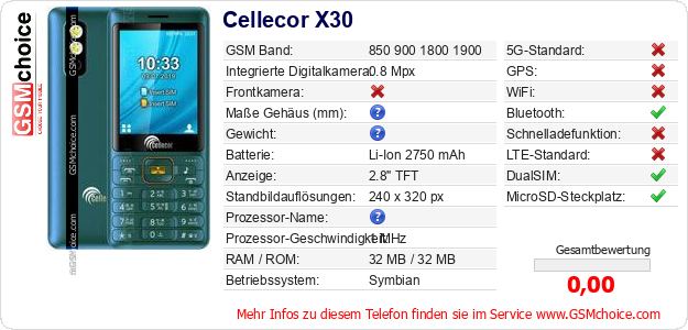 Hast du eigene Webseite? Willst du die Informationen über Standarddaten des Handys Cellecor X30 irgendwo veröffentlichen? Das ist sehr einfach. Du kannst das Bild herunterladen oder kopieren und auf der Webseite folgenden Code hinzufügen:Das Einfügen von diesem Code verursacht das Anzeigen von dem folgenden Bild: