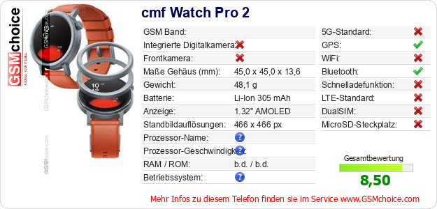 Hast du eigene Webseite? Willst du die Informationen über Standarddaten des Handys cmf Watch Pro 2 irgendwo veröffentlichen? Das ist sehr einfach. Du kannst das Bild herunterladen oder kopieren und auf der Webseite folgenden Code hinzufügen:Das Einfügen von diesem Code verursacht das Anzeigen von dem folgenden Bild: