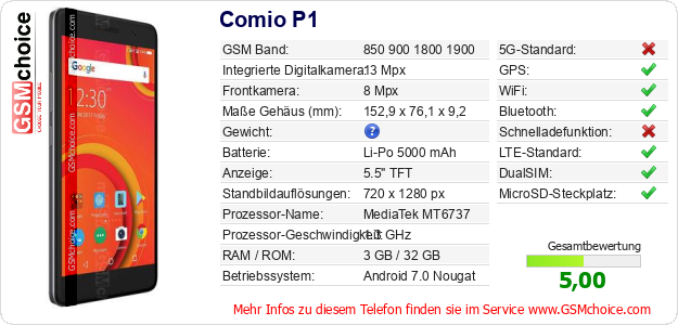 Hast du eigene Webseite? Willst du die Informationen über Standarddaten des Handys Comio P1 irgendwo veröffentlichen? Das ist sehr einfach. Du kannst das Bild herunterladen oder kopieren und auf der Webseite folgenden Code hinzufügen:Das Einfügen von diesem Code verursacht das Anzeigen von dem folgenden Bild: