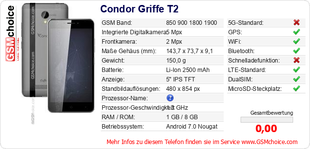 Hast du eigene Webseite? Willst du die Informationen über Standarddaten des Handys Condor Griffe T2 irgendwo veröffentlichen? Das ist sehr einfach. Du kannst das Bild herunterladen oder kopieren und auf der Webseite folgenden Code hinzufügen:Das Einfügen von diesem Code verursacht das Anzeigen von dem folgenden Bild: