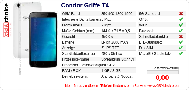 Hast du eigene Webseite? Willst du die Informationen über Standarddaten des Handys Condor Griffe T4 irgendwo veröffentlichen? Das ist sehr einfach. Du kannst das Bild herunterladen oder kopieren und auf der Webseite folgenden Code hinzufügen:Das Einfügen von diesem Code verursacht das Anzeigen von dem folgenden Bild: