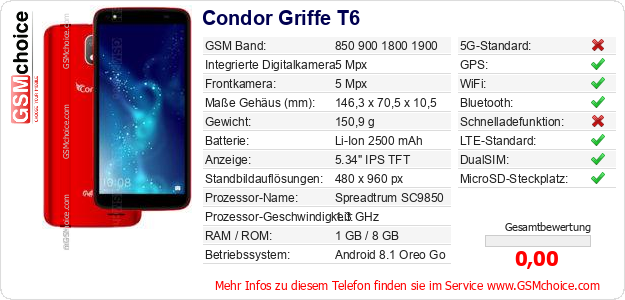 Hast du eigene Webseite? Willst du die Informationen über Standarddaten des Handys Condor Griffe T6 irgendwo veröffentlichen? Das ist sehr einfach. Du kannst das Bild herunterladen oder kopieren und auf der Webseite folgenden Code hinzufügen:Das Einfügen von diesem Code verursacht das Anzeigen von dem folgenden Bild: