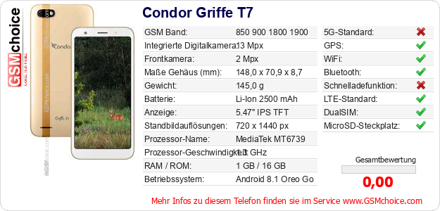 Hast du eigene Webseite? Willst du die Informationen über Standarddaten des Handys Condor Griffe T7 irgendwo veröffentlichen? Das ist sehr einfach. Du kannst das Bild herunterladen oder kopieren und auf der Webseite folgenden Code hinzufügen:Das Einfügen von diesem Code verursacht das Anzeigen von dem folgenden Bild: