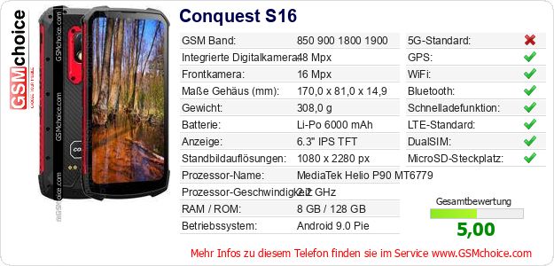 Hast du eigene Webseite? Willst du die Informationen über Standarddaten des Handys Conquest S16 irgendwo veröffentlichen? Das ist sehr einfach. Du kannst das Bild herunterladen oder kopieren und auf der Webseite folgenden Code hinzufügen:Das Einfügen von diesem Code verursacht das Anzeigen von dem folgenden Bild: