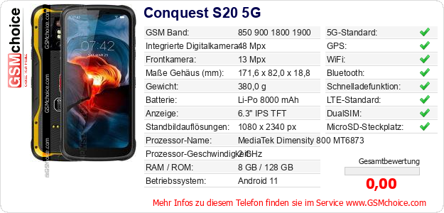 Hast du eigene Webseite? Willst du die Informationen über Standarddaten des Handys Conquest S20 5G irgendwo veröffentlichen? Das ist sehr einfach. Du kannst das Bild herunterladen oder kopieren und auf der Webseite folgenden Code hinzufügen:Das Einfügen von diesem Code verursacht das Anzeigen von dem folgenden Bild: