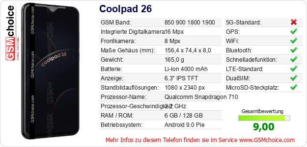 Hast du eigene Webseite? Willst du die Informationen über Standarddaten des Handys Coolpad 26 irgendwo veröffentlichen? Das ist sehr einfach. Du kannst das Bild herunterladen oder kopieren und auf der Webseite folgenden Code hinzufügen:Das Einfügen von diesem Code verursacht das Anzeigen von dem folgenden Bild: