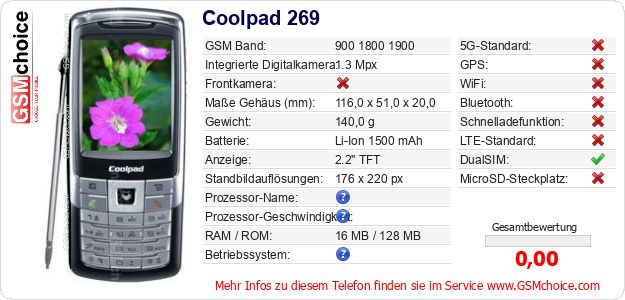 Hast du eigene Webseite? Willst du die Informationen über Standarddaten des Handys Coolpad 269 irgendwo veröffentlichen? Das ist sehr einfach. Du kannst das Bild herunterladen oder kopieren und auf der Webseite folgenden Code hinzufügen:Das Einfügen von diesem Code verursacht das Anzeigen von dem folgenden Bild: