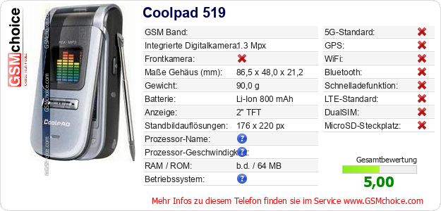 Hast du eigene Webseite? Willst du die Informationen über Standarddaten des Handys Coolpad 519 irgendwo veröffentlichen? Das ist sehr einfach. Du kannst das Bild herunterladen oder kopieren und auf der Webseite folgenden Code hinzufügen:Das Einfügen von diesem Code verursacht das Anzeigen von dem folgenden Bild: