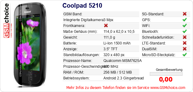 Hast du eigene Webseite? Willst du die Informationen über Standarddaten des Handys Coolpad 5210 irgendwo veröffentlichen? Das ist sehr einfach. Du kannst das Bild herunterladen oder kopieren und auf der Webseite folgenden Code hinzufügen:Das Einfügen von diesem Code verursacht das Anzeigen von dem folgenden Bild: