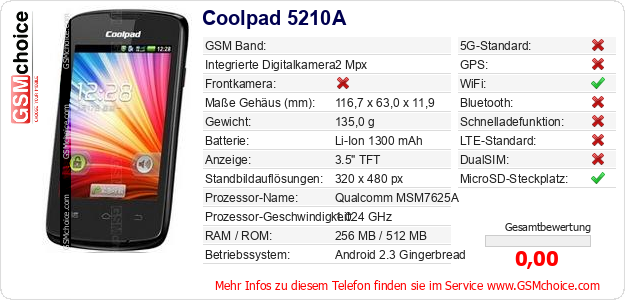 Hast du eigene Webseite? Willst du die Informationen über Standarddaten des Handys Coolpad 5210A irgendwo veröffentlichen? Das ist sehr einfach. Du kannst das Bild herunterladen oder kopieren und auf der Webseite folgenden Code hinzufügen:Das Einfügen von diesem Code verursacht das Anzeigen von dem folgenden Bild: