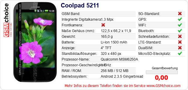 Hast du eigene Webseite? Willst du die Informationen über Standarddaten des Handys Coolpad 5211 irgendwo veröffentlichen? Das ist sehr einfach. Du kannst das Bild herunterladen oder kopieren und auf der Webseite folgenden Code hinzufügen:Das Einfügen von diesem Code verursacht das Anzeigen von dem folgenden Bild: