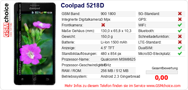 Hast du eigene Webseite? Willst du die Informationen über Standarddaten des Handys Coolpad 5218D irgendwo veröffentlichen? Das ist sehr einfach. Du kannst das Bild herunterladen oder kopieren und auf der Webseite folgenden Code hinzufügen:Das Einfügen von diesem Code verursacht das Anzeigen von dem folgenden Bild: