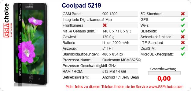 Hast du eigene Webseite? Willst du die Informationen über Standarddaten des Handys Coolpad 5219 irgendwo veröffentlichen? Das ist sehr einfach. Du kannst das Bild herunterladen oder kopieren und auf der Webseite folgenden Code hinzufügen:Das Einfügen von diesem Code verursacht das Anzeigen von dem folgenden Bild: