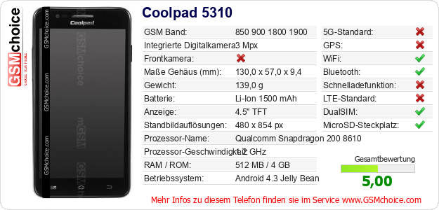 Hast du eigene Webseite? Willst du die Informationen über Standarddaten des Handys Coolpad 5310 irgendwo veröffentlichen? Das ist sehr einfach. Du kannst das Bild herunterladen oder kopieren und auf der Webseite folgenden Code hinzufügen:Das Einfügen von diesem Code verursacht das Anzeigen von dem folgenden Bild: