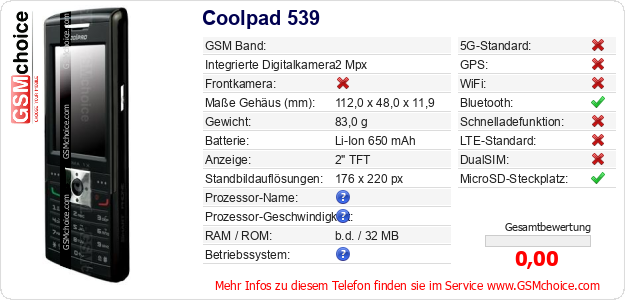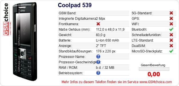 Hast du eigene Webseite? Willst du die Informationen über Standarddaten des Handys Coolpad 539 irgendwo veröffentlichen? Das ist sehr einfach. Du kannst das Bild herunterladen oder kopieren und auf der Webseite folgenden Code hinzufügen:Das Einfügen von diesem Code verursacht das Anzeigen von dem folgenden Bild: