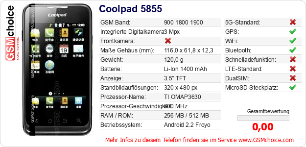Hast du eigene Webseite? Willst du die Informationen über Standarddaten des Handys Coolpad 5855 irgendwo veröffentlichen? Das ist sehr einfach. Du kannst das Bild herunterladen oder kopieren und auf der Webseite folgenden Code hinzufügen:Das Einfügen von diesem Code verursacht das Anzeigen von dem folgenden Bild:
