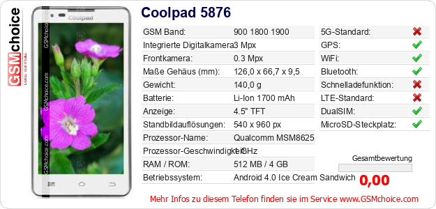 Hast du eigene Webseite? Willst du die Informationen über Standarddaten des Handys Coolpad 5876 irgendwo veröffentlichen? Das ist sehr einfach. Du kannst das Bild herunterladen oder kopieren und auf der Webseite folgenden Code hinzufügen:Das Einfügen von diesem Code verursacht das Anzeigen von dem folgenden Bild: