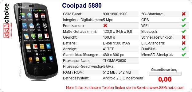 Hast du eigene Webseite? Willst du die Informationen über Standarddaten des Handys Coolpad 5880 irgendwo veröffentlichen? Das ist sehr einfach. Du kannst das Bild herunterladen oder kopieren und auf der Webseite folgenden Code hinzufügen:Das Einfügen von diesem Code verursacht das Anzeigen von dem folgenden Bild:
