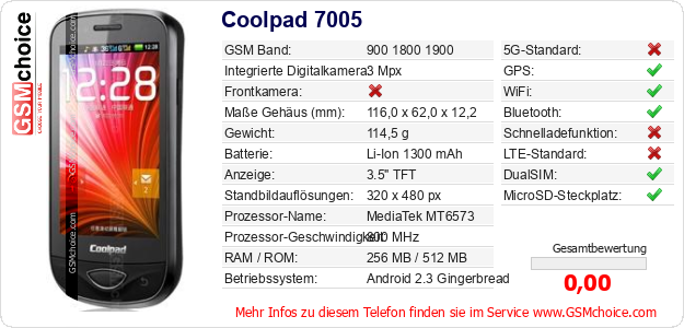 Hast du eigene Webseite? Willst du die Informationen über Standarddaten des Handys Coolpad 7005 irgendwo veröffentlichen? Das ist sehr einfach. Du kannst das Bild herunterladen oder kopieren und auf der Webseite folgenden Code hinzufügen:Das Einfügen von diesem Code verursacht das Anzeigen von dem folgenden Bild: