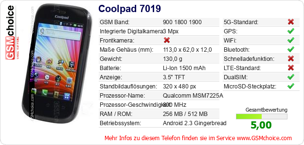 Hast du eigene Webseite? Willst du die Informationen über Standarddaten des Handys Coolpad 7019 irgendwo veröffentlichen? Das ist sehr einfach. Du kannst das Bild herunterladen oder kopieren und auf der Webseite folgenden Code hinzufügen:Das Einfügen von diesem Code verursacht das Anzeigen von dem folgenden Bild: