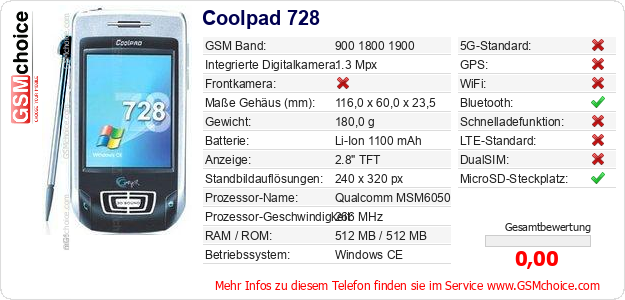 Hast du eigene Webseite? Willst du die Informationen über Standarddaten des Handys Coolpad 728 irgendwo veröffentlichen? Das ist sehr einfach. Du kannst das Bild herunterladen oder kopieren und auf der Webseite folgenden Code hinzufügen:Das Einfügen von diesem Code verursacht das Anzeigen von dem folgenden Bild: