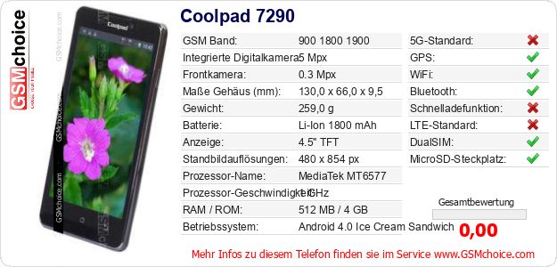 Hast du eigene Webseite? Willst du die Informationen über Standarddaten des Handys Coolpad 7290 irgendwo veröffentlichen? Das ist sehr einfach. Du kannst das Bild herunterladen oder kopieren und auf der Webseite folgenden Code hinzufügen:Das Einfügen von diesem Code verursacht das Anzeigen von dem folgenden Bild: