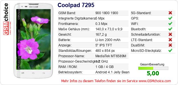 Hast du eigene Webseite? Willst du die Informationen über Standarddaten des Handys Coolpad 7295 irgendwo veröffentlichen? Das ist sehr einfach. Du kannst das Bild herunterladen oder kopieren und auf der Webseite folgenden Code hinzufügen:Das Einfügen von diesem Code verursacht das Anzeigen von dem folgenden Bild: