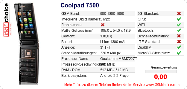 Hast du eigene Webseite? Willst du die Informationen über Standarddaten des Handys Coolpad 7500 irgendwo veröffentlichen? Das ist sehr einfach. Du kannst das Bild herunterladen oder kopieren und auf der Webseite folgenden Code hinzufügen:Das Einfügen von diesem Code verursacht das Anzeigen von dem folgenden Bild:
