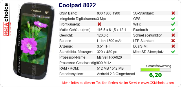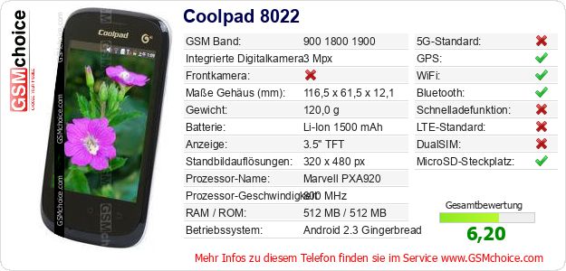 Hast du eigene Webseite? Willst du die Informationen über Standarddaten des Handys Coolpad 8022 irgendwo veröffentlichen? Das ist sehr einfach. Du kannst das Bild herunterladen oder kopieren und auf der Webseite folgenden Code hinzufügen:Das Einfügen von diesem Code verursacht das Anzeigen von dem folgenden Bild: