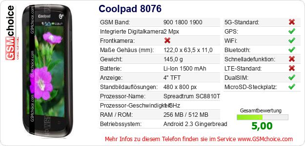 Hast du eigene Webseite? Willst du die Informationen über Standarddaten des Handys Coolpad 8076 irgendwo veröffentlichen? Das ist sehr einfach. Du kannst das Bild herunterladen oder kopieren und auf der Webseite folgenden Code hinzufügen:Das Einfügen von diesem Code verursacht das Anzeigen von dem folgenden Bild: