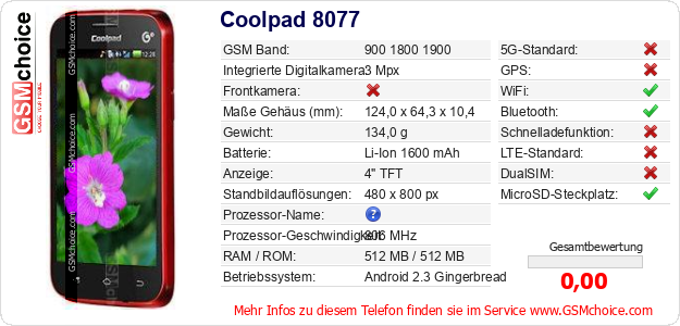 Hast du eigene Webseite? Willst du die Informationen über Standarddaten des Handys Coolpad 8077 irgendwo veröffentlichen? Das ist sehr einfach. Du kannst das Bild herunterladen oder kopieren und auf der Webseite folgenden Code hinzufügen:Das Einfügen von diesem Code verursacht das Anzeigen von dem folgenden Bild: